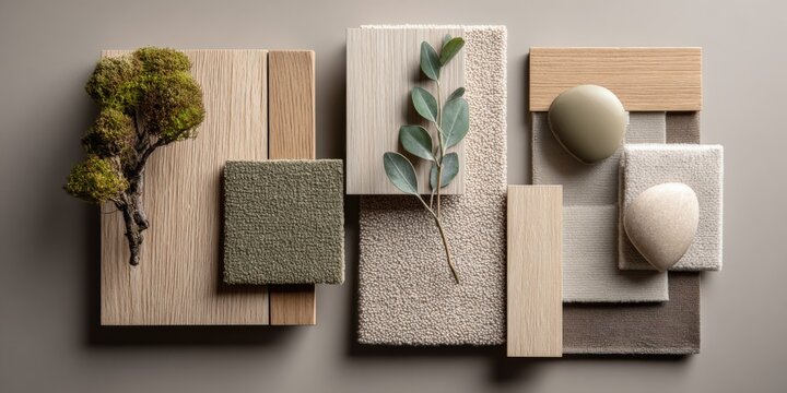 Interior design mood board featuring natural textures, wood swatches, fabric samples, and organic elements