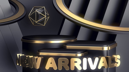 Three luxury black and gold podiums of different heights to showcase your products. promo poster New Arrivals. abstract modern background. 3d render