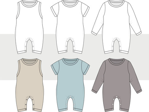 new born baby boys kids romper unisex bodysuit set infant onesies baby clothes set flat sketch vector illustration, cad.