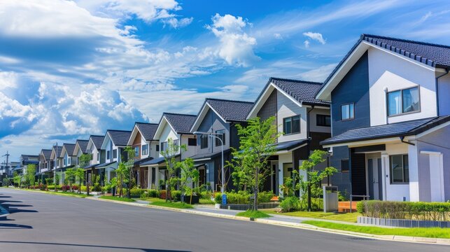 Low-density two story private homes in rural residential suburbs outside of Rochester, New York. Upscale suburban houses with large lot size and green grassy lawns in summer season