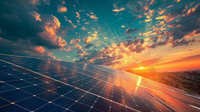 solar energy panels on sunset sky background, photovoltaic power cell system green house eco industry.