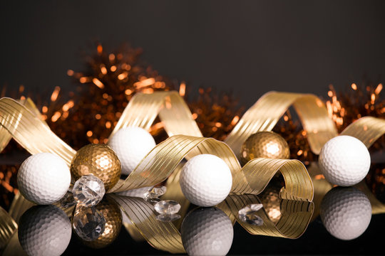 Golf Christmas with golden and white balls on black background