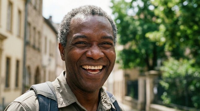 Smiling man enjoys a sunny day in a historic street while exploring a new city in Africa with a backpack