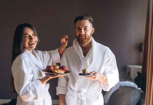 The guy and the girl bathrobe, girl feeds the guy fruit
