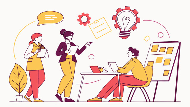 Diverse team collaborating on a new project idea brainstorming solutions and presenting findings in a modern office setting with visual aids and symbols
