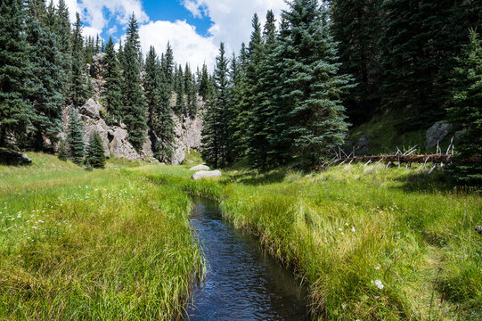 Stream through lush, green grassy meadow and forest of spruce and fir trees at the Valles Caldera National Preserve, New Mexico