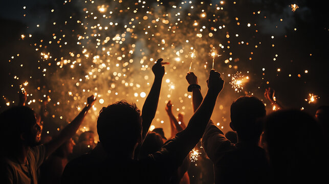 group of people celebrate new year on the party and hold fireflies