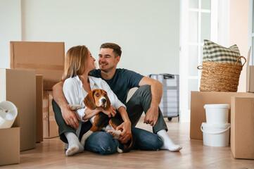 Front view. Sitting together. Young couple with dog are moving to new home