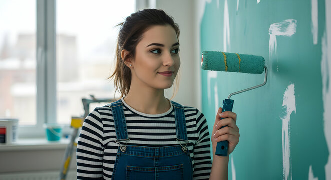 Young woman painting wall home renovation DIY project happy smiling female homeowner interior design teal color fresh start new home decor