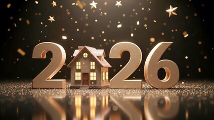 Real estate trends 2026, 2026 Real Estate Concept with House Model and Golden Celebration Confetti for New Year Housing Market and Investment
