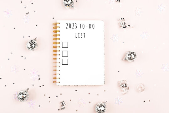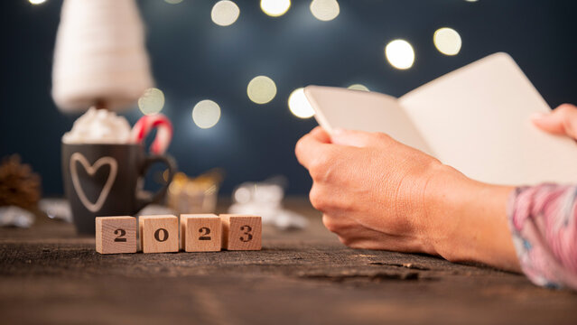 2023 year goals. A notepad with New Year resolutions and holiday decor. Plan, journal, to-do list. Thougths, dreams and wishes.