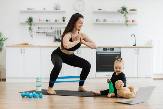 Newborn Concept. Mother and child on a white bed. Mom and baby boy playing in bedroom. Mother is playing mobile phone on bed.
