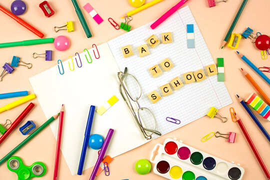In the center is a postcard with the inscription back to school surrounded by bright markers and pens, creating an atmosphere of readiness for the new school year and inspiration for school days.