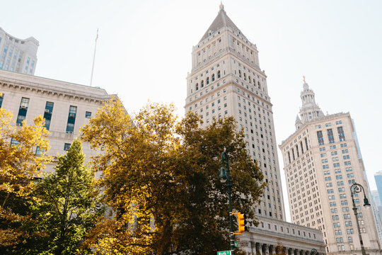 Urban skyline with tall buildings and autumn trees in New York