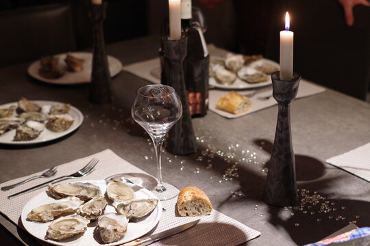 dim light white silver and blue romantic new year eve or christmas table in a luxury restaurant with champagne