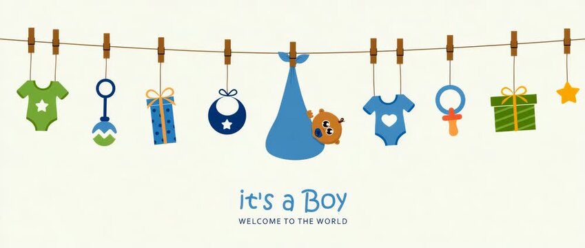baby boy welcome greetings for childbirth with hanging utensils illustrated animation