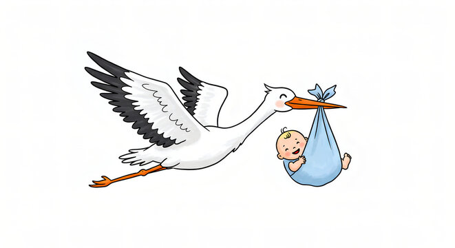 Whimsical Illustration of a Stork Flying Through the Sky, Carrying a Baby Wrapped in a Cloth Bundle, with Soft Colors and a Heartwarming Atmosphere of Baby Arrival