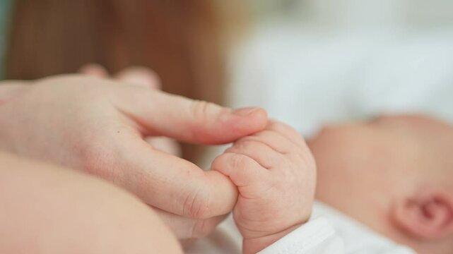 Happy family. Tiny newborn infant baby little hand on mother hand palm. Newborn baby holding parent finger after birth. Mom baby at home. Support protection of new life. Handle with care