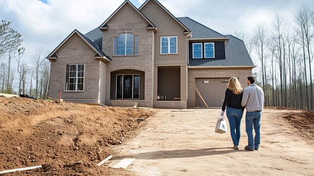 Couple walks toward their newly constructed home at a residential site surrounded by trees on a sunny day in spring