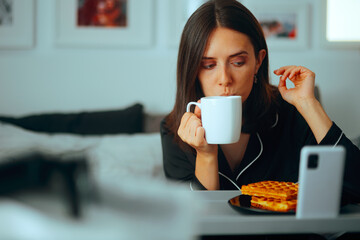 Woman Having Breakfast in Bed Watching the News on her Phone. Lady checking social media while drinking her morning coffee