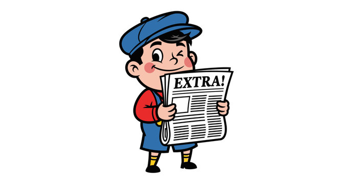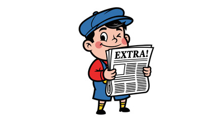 Cartoon newsboy with cap winking holding a newspaper shouting extra illustration