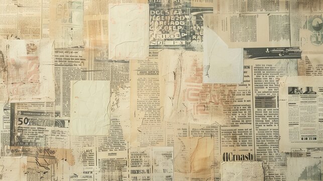 Vintage newspaper and book page collage with faded text and aged paper textures