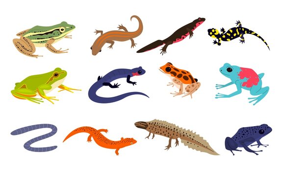 Tropical amphibian. Different frogs and lizards breed, toad and chameleon various colors, salamander, newt and triton, terrarium inhabitants, rainforest animal exotic reptiles, vector set