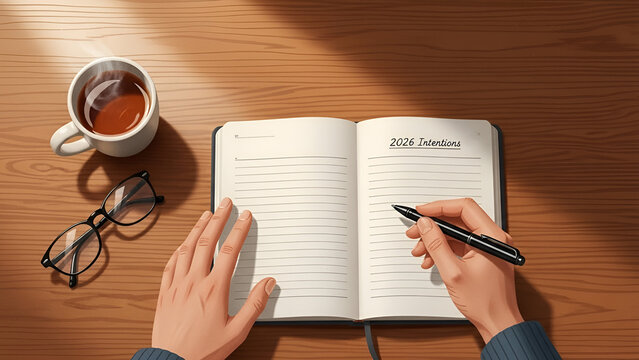 Illustration of overhead view of person writing in a journal or planner with a pen, next to a cup of coffee and reading glasses on a wooden desk
