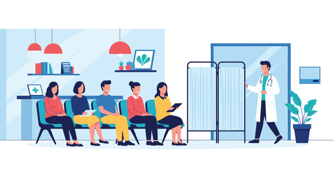 Male doctor in a white coat calling the next patient from a busy waiting room full of people at a hospital or clinic.