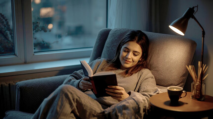 young woman is curled up on a soft armchair next to a large window, reading a physical book.warm, soft light from a lamp illuminates her and the book.She has a peaceful, content expression on her face