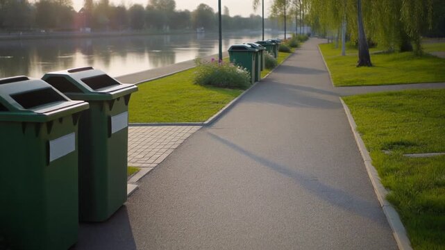 Park Pathway Lined with Green Trash Bins Next to a Calm River at Sunset Keywords: park, pathway, walkway, river, water, nature, green