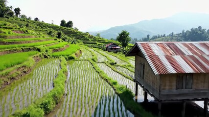 Traditional stilt house next to vibrant green rice terraces and flooded paddies in a mountainous region, 4k high quality video