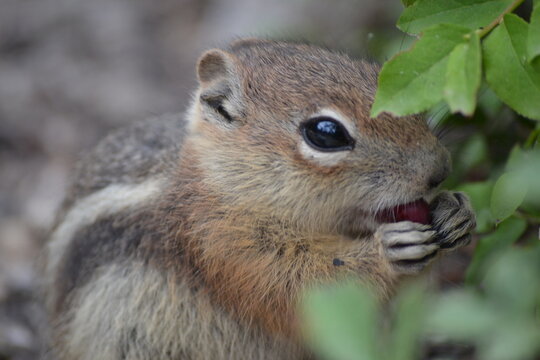 Close-up of a brown chipmunk or golden-mantled ground squirrel sitting on the ground under a bush eating a red berry.