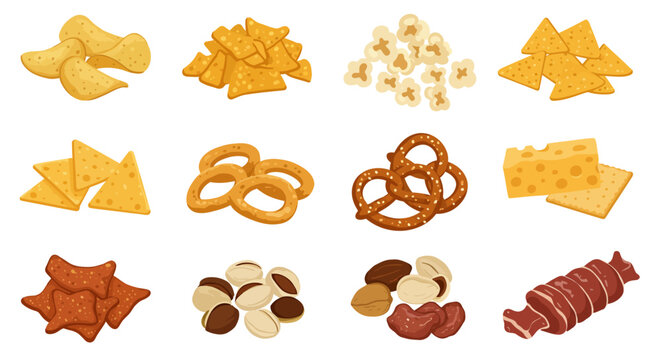 Cartoon snacks chips nachos popcorn pretzels cheese nuts and meat