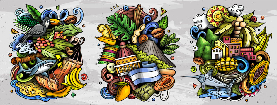 Nicaragua cartoon vector doodle designs set. Colorful detailed compositions with lot of Nicaraguan objects and symbols. Isolated on white illustrations