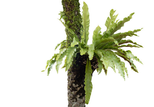 Asplenium nidus fern or Bird's nest fern and moss combine on palm tree isolated on white background with clipping path,  famous plant for decoration indoor and outdoor