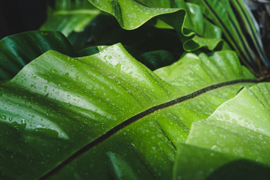 A bird's nest fern, Asplenium nidus, covered in water drops.; Framingham, Massachusetts.