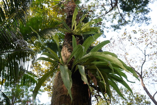 Asplenium nidus, commonly known as bird's nest fern, growing on a tree trunk