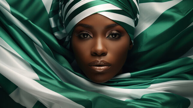 Woman in Nigerian Flag Green White Dress and Headwrap. Nigeria Independence Day. Model in Fashion African Turban over Gray. Muslim Women wearing Green Headscarf drape