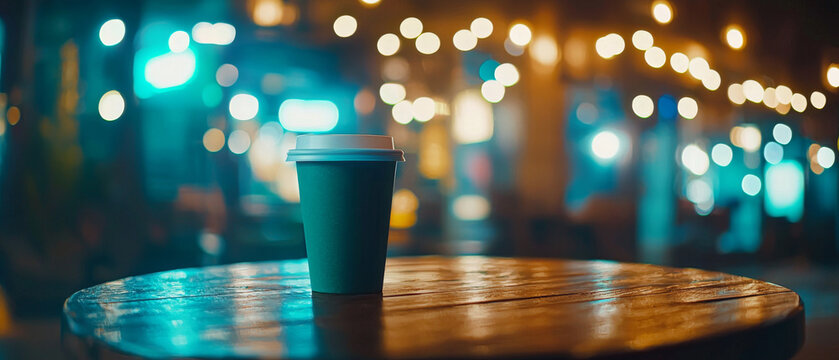 Night scene:  Green to-go cup on wooden table, bokeh lights blur background
