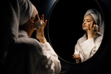 Smiling beautiful lady apply skincare cream look in mirror