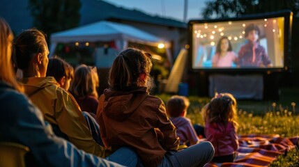Families watching movie outdoors on screen under night sky diverse audience. Concept Movie Night, Outdoor Entertainment, Family Fun, Stargazing, Community Bonding.