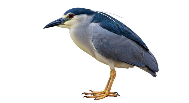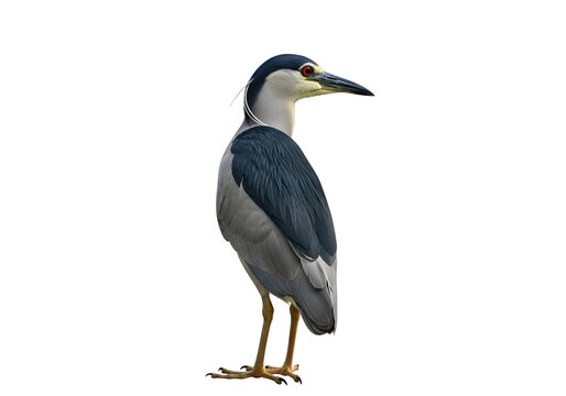 A side view of a black-crowned night heron, presented against a plain black background, showcasing its detailed plumage and posture.