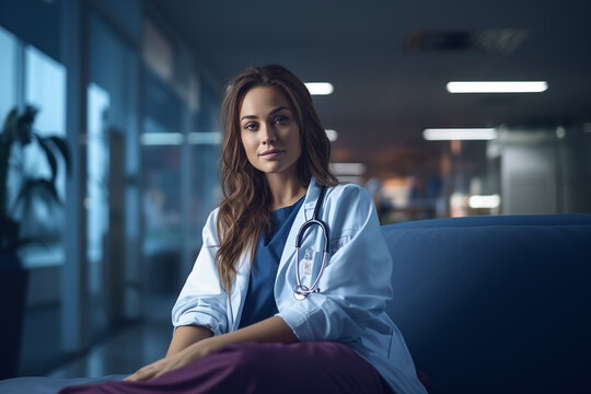 A healthcare worker, adorned in a white lab coat and stethoscope, sits contemplatively in a well-lit hospital corridor during the night shift