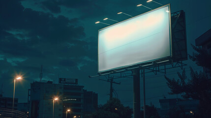 Large blank billboard middle city night is illuminated horizontal advertising