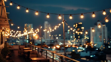 Charming rooftop evening with string lights.