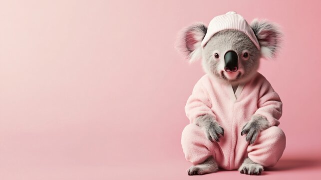 A koala in pajamas with a nightcap on a pastel pink background, copy space