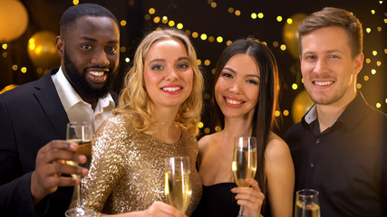Laugh, drinks and party with couple at nightclub for music, relax and celebration. Happy hour, cocktails and social event with man and woman flirting for cheers, new years and alcohol together