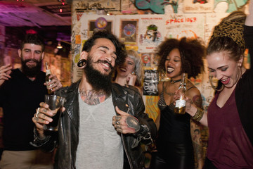 party people in a nightclub with neon lights happy dancing and celebrating birthday