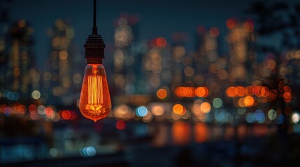 Light bulb hanging in front of a city skyline at night with blurred lights in the background creating a vibrant atmosphere for evening activities